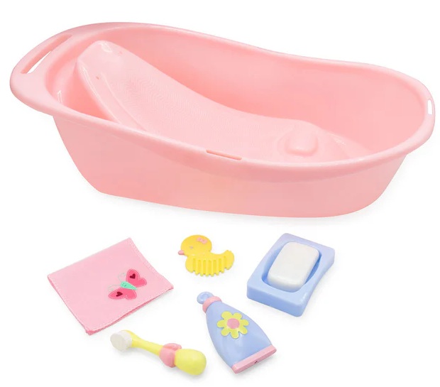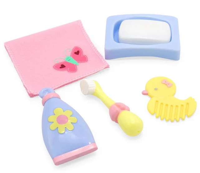 Looking for doll accessories for your baby doll this Bathtime Play Set is perfect. 7 PIECE SET includes bathtub, pretend soap dish, soap, rubber ducky, toothpaste, toothbrush and cute ducky comb