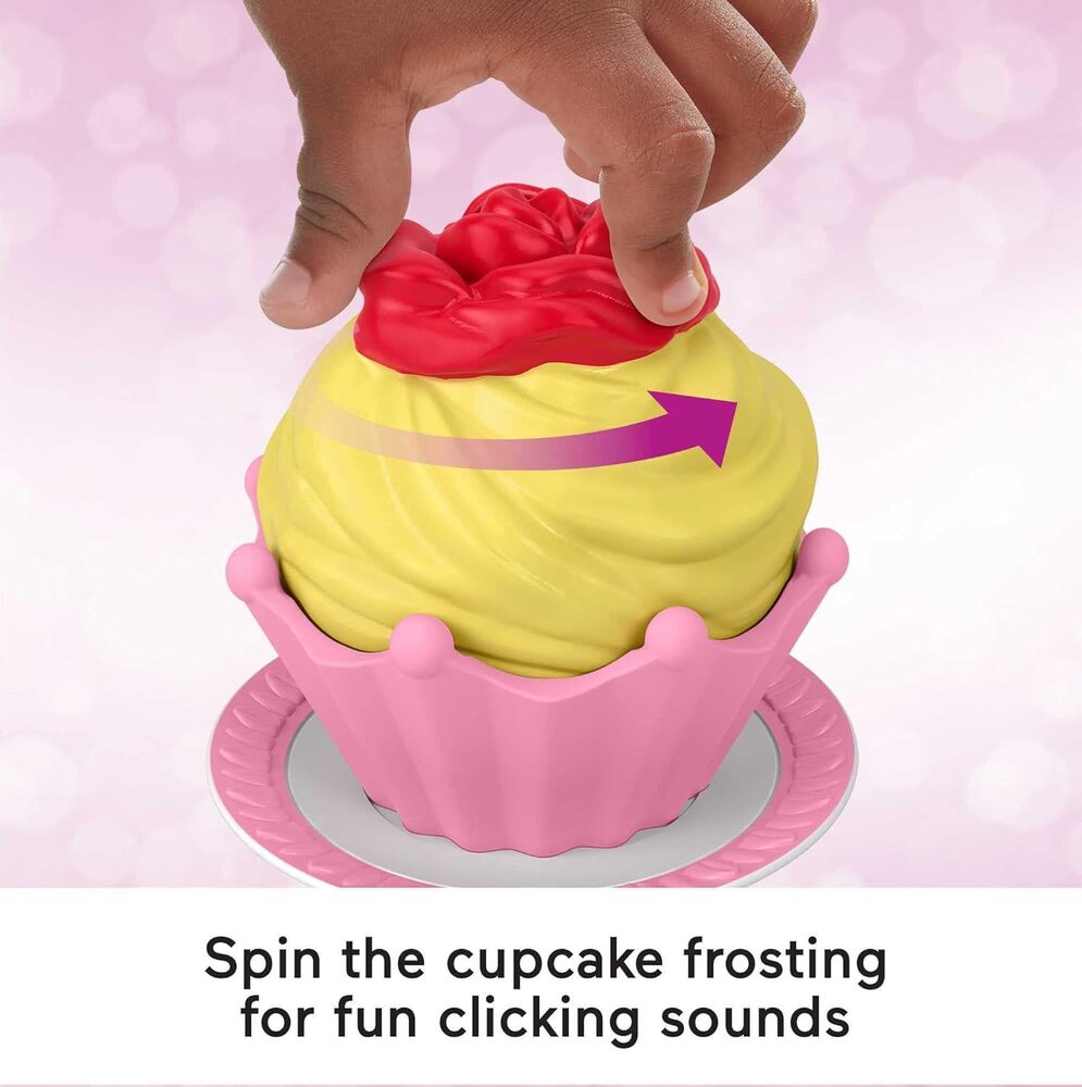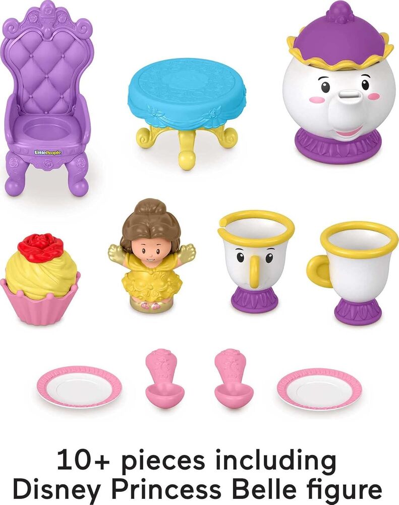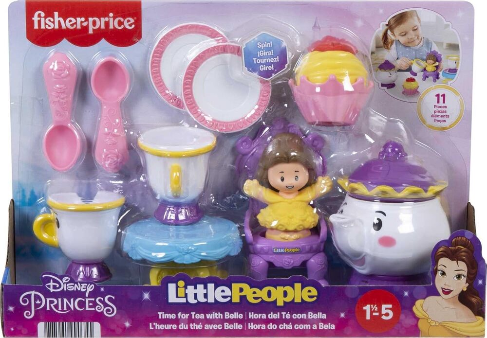 Little People® pretend playset featuring Disney Princess Belle and other characters from Disney's Beauty and the Beast 10+ play pieces, including Disney Princess Belle figure, Mrs. Potts teapot and Chip the teacup Full-size pretend cupcake with frosting that spins and clicks Figure and play pieces sized just right for small hands to grasp and move, helping to strengthen fine motor skills For toddler and preschool Disney fans ages 1 - 5 years