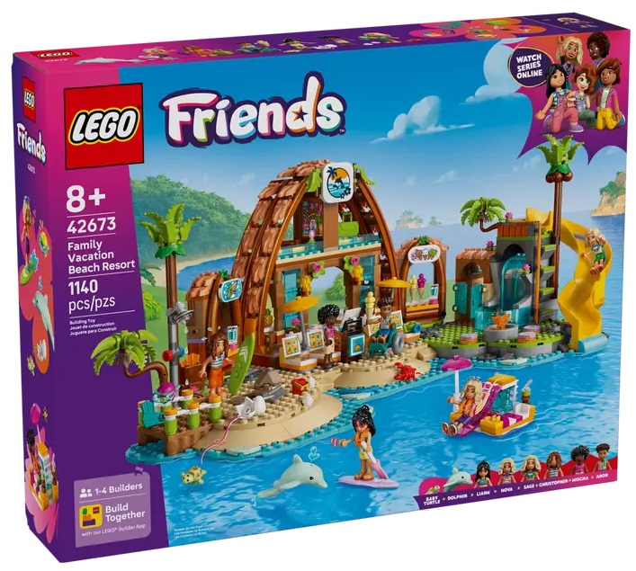 Enjoy family fun, vacation style with this action-packed kids’ building set toy for girls and boys aged 8 years old and up. The LEGO® Friends Family Vacation Beach Resort (42673) is full of stories and includes 6 LEGO Friends minidolls, a dolphin and a turtle figure, plus accessories for creative play.