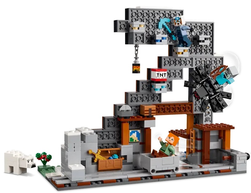 The set includes 3 minifigures: popular gaming character Alex, a Miner and a stray spider jockey. There’s also a baby polar bear figure at the mine’s surface. Kids extract Minecraft ore from the mine, load it into a minecart and transport it along the track to be stored in a chest. The cart can be filled with TNT and launched into the rock wall, blasting through the other side. And when the day’s mining adventures come to an end, the LEGO Minecraft pickaxe toy doubles as a striking display piece. For added digital fun, builders can zoom in, rotate models in 3D and track their progress using the intuitive LEGO Builder app. Contains 530 pieces.