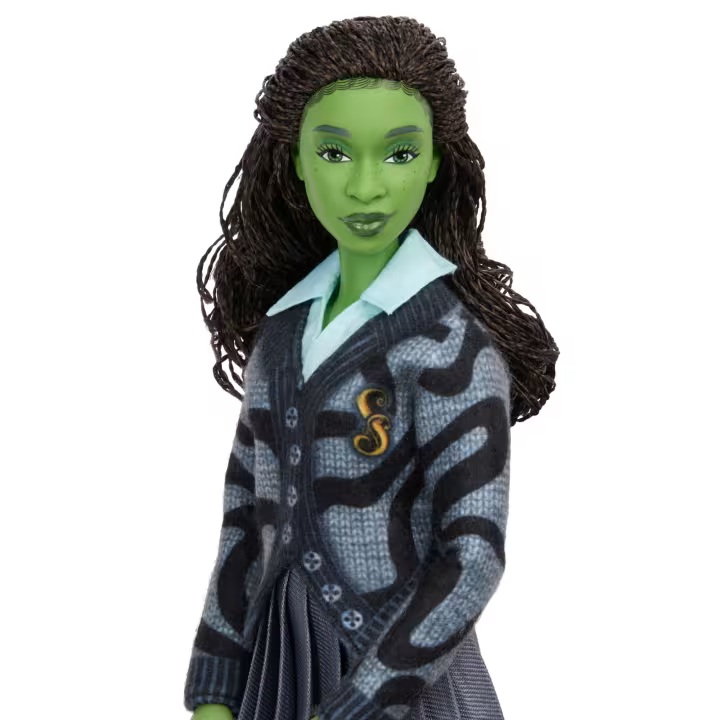 Inspired by Universal Pictures' Wicked, the Elphaba fashion doll is ready to enroll at the prestigious Shiz University. Dressed in her movie-inspired look, the fashion doll includes her removable school uniform, featuring her button up cardigan, asymmetrical skirt, and leggings! Elphaba also features her iconic look with true-to-movie details, like her long, braided hair and green skin. Fans will want to collect all the dolls from the Land of Oz! Each sold separately, subject to availability. Dolls cannot stand alone. Colors and decorations may vary.