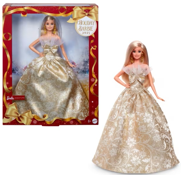 The 2025 Holiday Barbie doll shines like a star in and out of her packaging. Showcasing beautiful combinations of silver and gold damask print at the skirt, Barbie catches eyes in her gorgeous strapless gown, with a white, ruffle tulle trim at the collar. Barbie pairs her stunning gown with gold, drop earrings and pearlized gold heels. Her long beautiful, blonde hair and makeup complement her classic look. In packaging that's ideal for display, this collectible doll is for fans 6-year-olds and up. Includes doll stand and Certificate of Authenticity. Doll cannot stand alone. Colors and decorations may vary.
