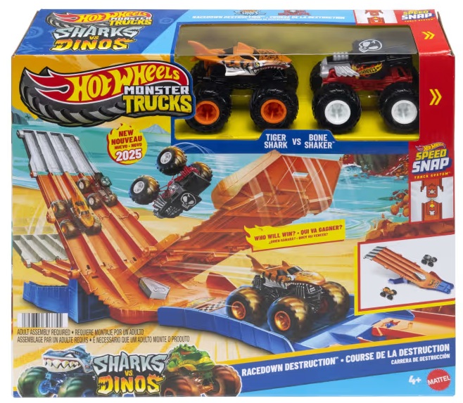 In the Hot Wheels Monster Trucks Sharks vs. Dinos Racedown Destruction Track set, Mega-Wrex and Tiger Shark compete to see who's the fastest and who will crash.