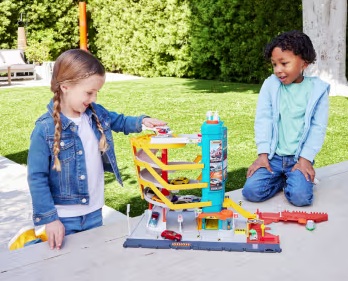 The 5-level parking garage includes a kid-powered lift and gates for dynamic storytelling. It can also be used for storage, holding up to 12 1:64 scale vehicles. (One 1:64 scale car, boat and helicopter are included. Additional vehicles sold separately.)