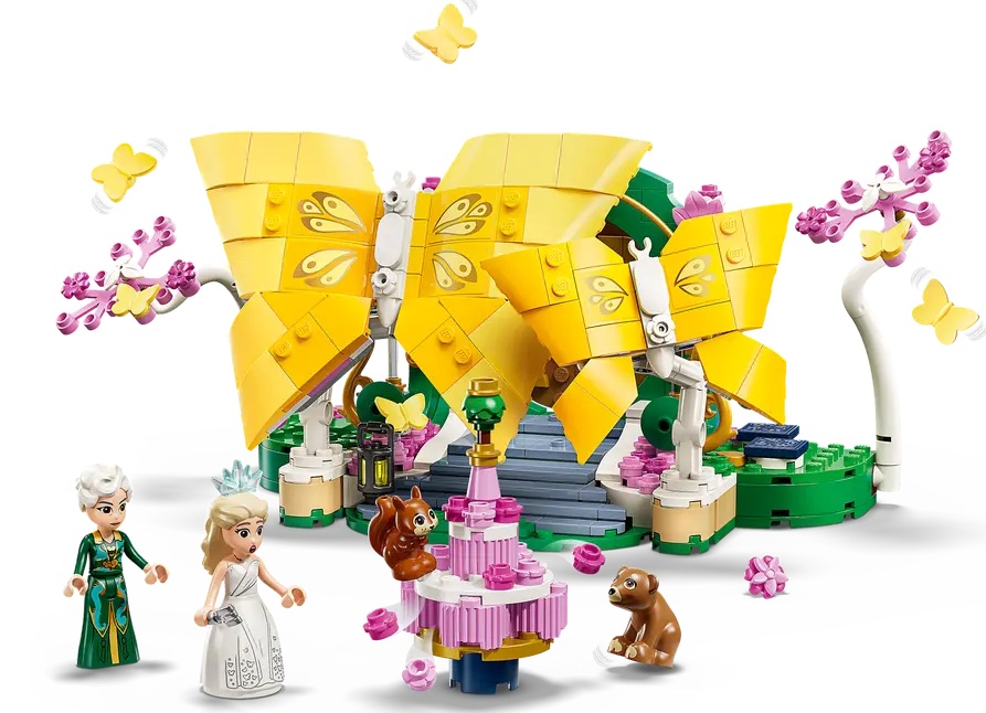 Kids pull apart the giant posable LEGO butterfly building toys to reveal the wedding scene. This fantasy gift packed with recognizable details from the movie, including the wedding cake, is a heart-shaped invitation and Glinda’s bouquet from Fiyero. For authentic role play Glinda wears the gown and tiara from the movie, and has a changeable face as her day flips from delight to disaster when the included animal figures rampage through the scene.