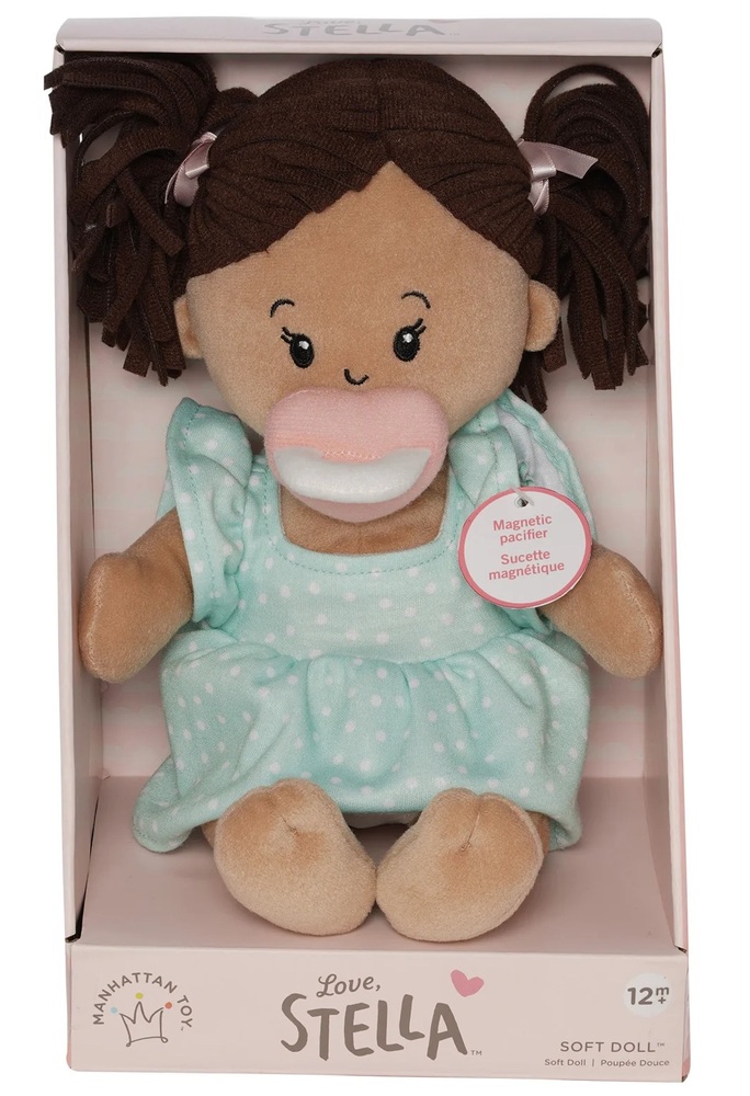 The Love, Stella dolls are the perfect size for holding, hugging, and nurturing role play to foster social and emotional development. Dolls are 100% soft with embroidered features, fabric hair, plump tummies, cute little belly buttons, and a signature magnetic pacifier design. The doll body has a weighted bottom and sits unassisted - perfect for playtime! Clothes are removable and feature hook-and-loop closures for supporting elementary dressing skills.