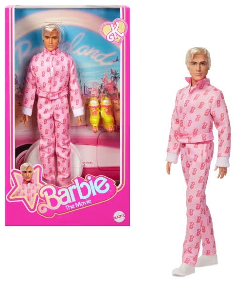 Greetings from Barbie Land! Modeled by Ryan Gosling’s Ken character in Barbie The Movie, this collectible Ken doll wears a pink jumpsuit with a Barbie “B” symbol throughout. Inspired by the scene where Ken joins Barbie on her adventure to the Real World, the Ken doll includes his iconic roller skates -- just in case he needs them -- while wearing his signature white sneakers! With his platinum blonde hair, he captures all of Ken's signature style! Celebrating Barbie The Movie, this Ken doll makes a great toy for fans and collectors alike. Doll stand included. Doll cannot stand alone. Colors and decorations may vary.