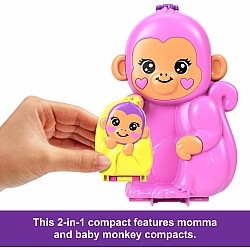 Go bananas with the Polly Pocket Momma Monkey & Baby -- this 2-in-1 fun compact playset is full of wild adventure! The baby monkey compact snuggles in momma's pouch before they each open to their own jungle-themed scenes. The playset comes complete with two micro dolls and 12 accessories, including adorable monkey pets. Swing from one compact to another on the zipline tram, make a splash in the pool, sway on the hammock, or share banana snacks in the baby monkey jungle. Perfect for on-the-go fun, pack up the compacts and carry with the purse strap. Makes a great gift for ages 4 years old and up, especially those who love jungle adventures with animal friends! Colors and decorations may vary.