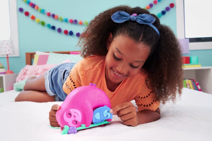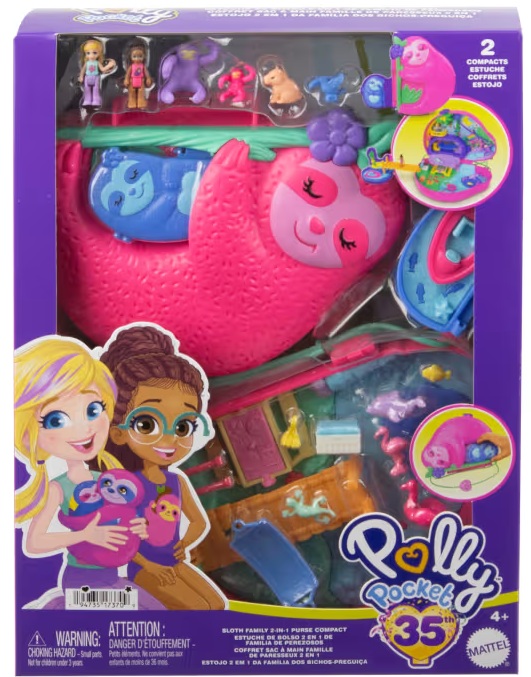 Swing into Polly Pocket fun with this adorable Sloth Family 2-in-1 Purse Compact! The purse exterior is shaped like a momma sloth with a baby sloth compact latched onto her belly! Both momma and baby sloth open to reveal tropical jungle themed playsets with 2 micro dolls and 12 accessories (including 8 pets)! The two compacts connect by bridge for the ultimate 2-in-1 play experience. Zoom along the zipline with a toucan friend in the momma sloth compact or open the sloth tent to reveal a comfy hammock. Make a splash and go for a spin in the waterfall pool! Then, walk over the bridge to the baby sloth compact and find a secret beach to pick bananas or go for a boat ride! When it's time to go, latch the two compacts and use the purse strap to play anytime, anywhere! The perfect gift for ages 4 years old and up, especially those who love animals! Colors and decorations may vary.