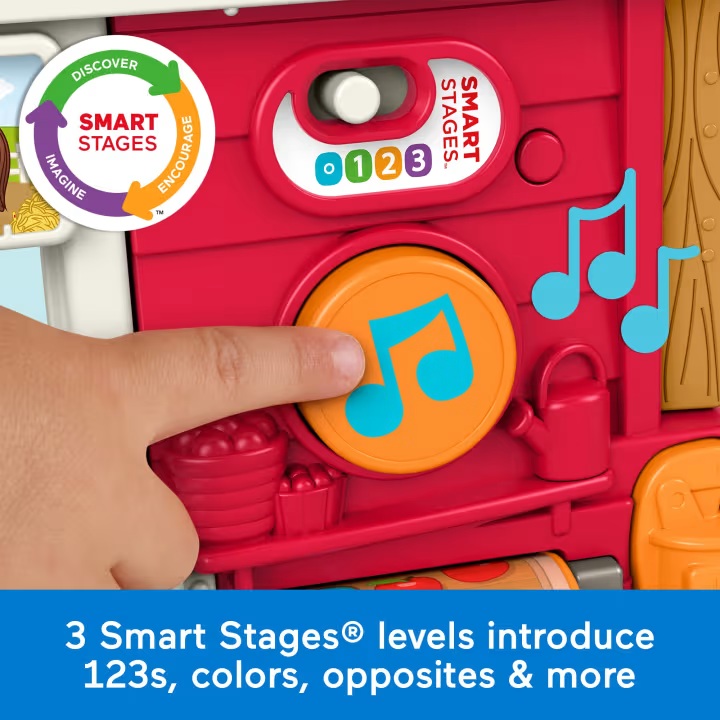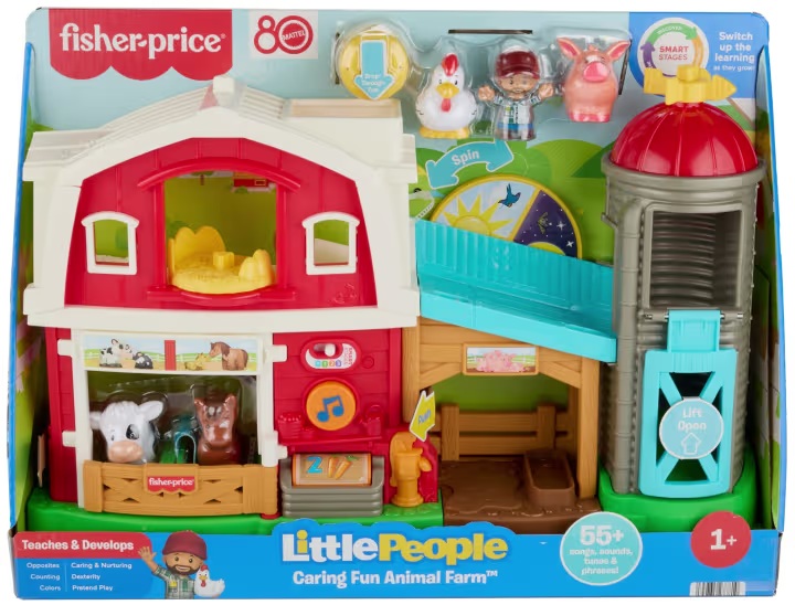 Toddlers can harvest endless hours of imaginative storytelling play with the Little People Caring Fun Animal Farm playset from Fisher-Price. This interactive playset features a two-story barn packed with hands-on activities all around, plus a drop-through silo and multiple stalls to house and care for the animals. As kids play out fun days on the farm, Smart Stages technology introduces opposites, colors, counting and more with 50+ sing-along songs, sounds and phrases. Includes 1 farmer figure, 4 animals, and 1 hay bale play piece. Requires 2 AA batteries, included. Colors and decorations may vary.