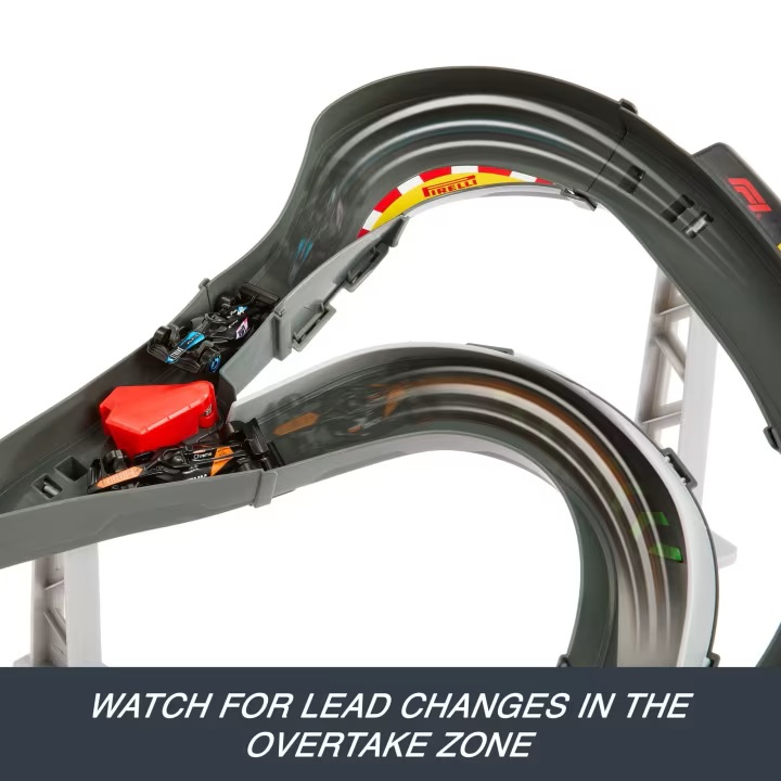 Emulate the thrilling excitement of a Formula 1 race with the Hot Wheels Racing Formula 1 Sprint Race Circuit Track Set. It includes three 1:64 scale die-cast Formula 1 cars with decos matching fan-favorite teams such as McLaren Formula 1 Team, BWT Alpine F1 Team and Visa Cash App RB Formula One Team, and two ways to play. For race mode, load the vehicles into the rev launcher and pump the lever to send them speeding onto the track. Will there be an amazing lead change as the cars get diverted into the overtake lane? In infinite mode, press the pump lever to keep cars racing around the set bypassing the diverters. Track pieces are compatible with Speed Snap Track for expanded racing and stunting. Additional track and sets sold separately. Teams, colors and decorations may vary.