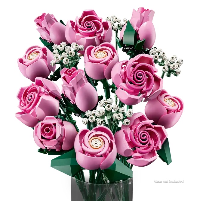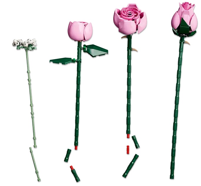 LEGO® flowers – The set features 4 roses in full bloom, 4 roses blossoming and 4 rosebuds, as well as 4 sprigs of baby’s breath with white flowers