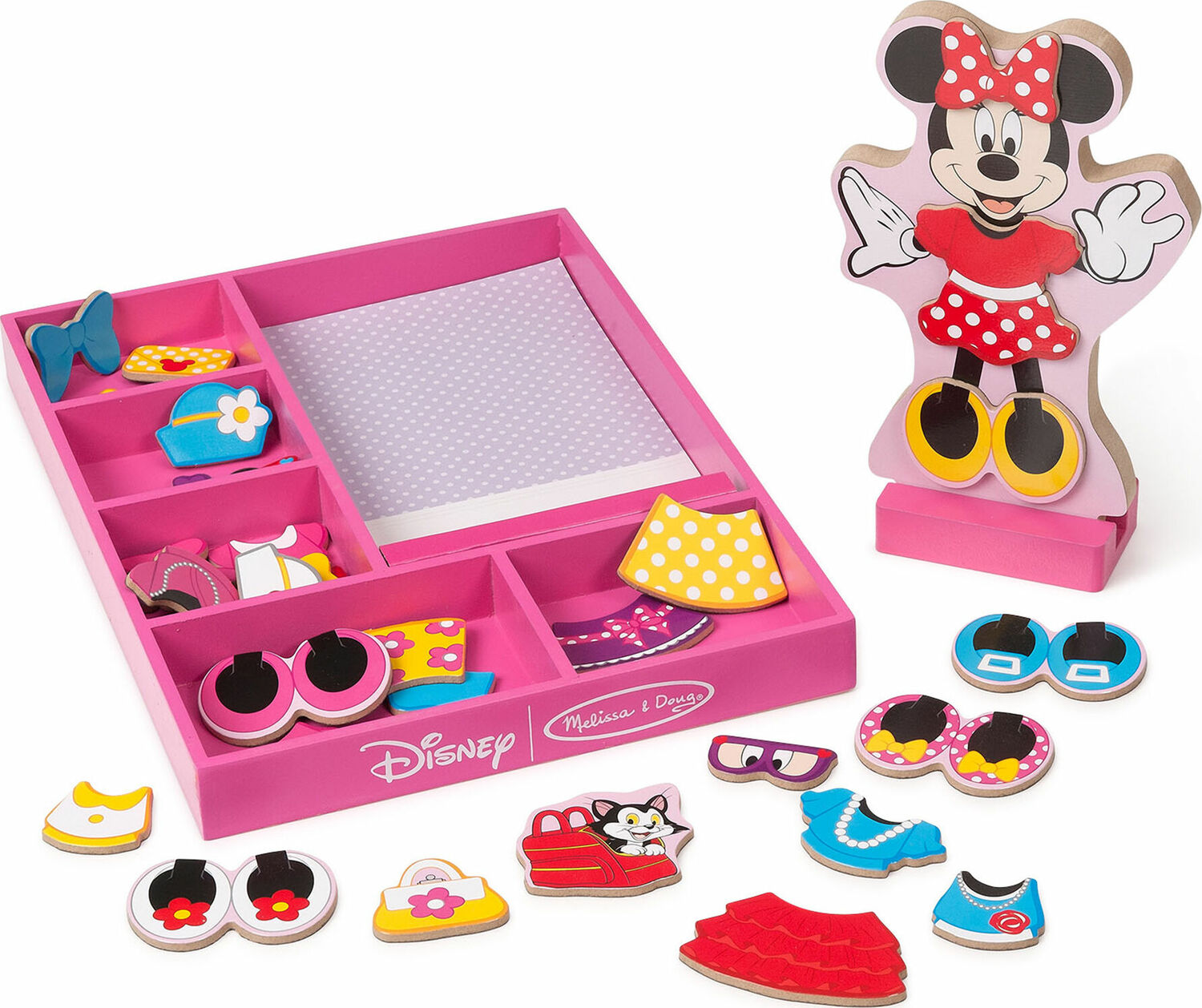 - Mix-and-match 35+ sturdy wooden magnetic pieces to create fabulous fashions Minnie would be proud to wear.
