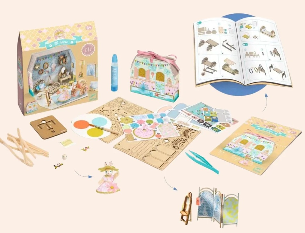 1 little house (closed size: 14.5 x 16.5 x 5 cm), 2 glazed wooden boards, 1 palette of dry paints and 1 paintbrush, 1 protective tablecloth, 3 sheets of pre-cut illustrated card, 3 sheets of stickers (1 sheet of illustrated stickers, 1 sheet of small transparent stickers, 1 sheet of double-sided foam stickers), 4 pipe cleaners, 1 illustrated wooden head and ears, 1 spool of thread, 1 sheet of pre-cut illustrated felt, 6 brad fasteners, 1 cardboard tool for making the mini character, 1 pair of precision tweezers, 1 tube of liquid glue with a fine tip, 1 set of detailed instructions